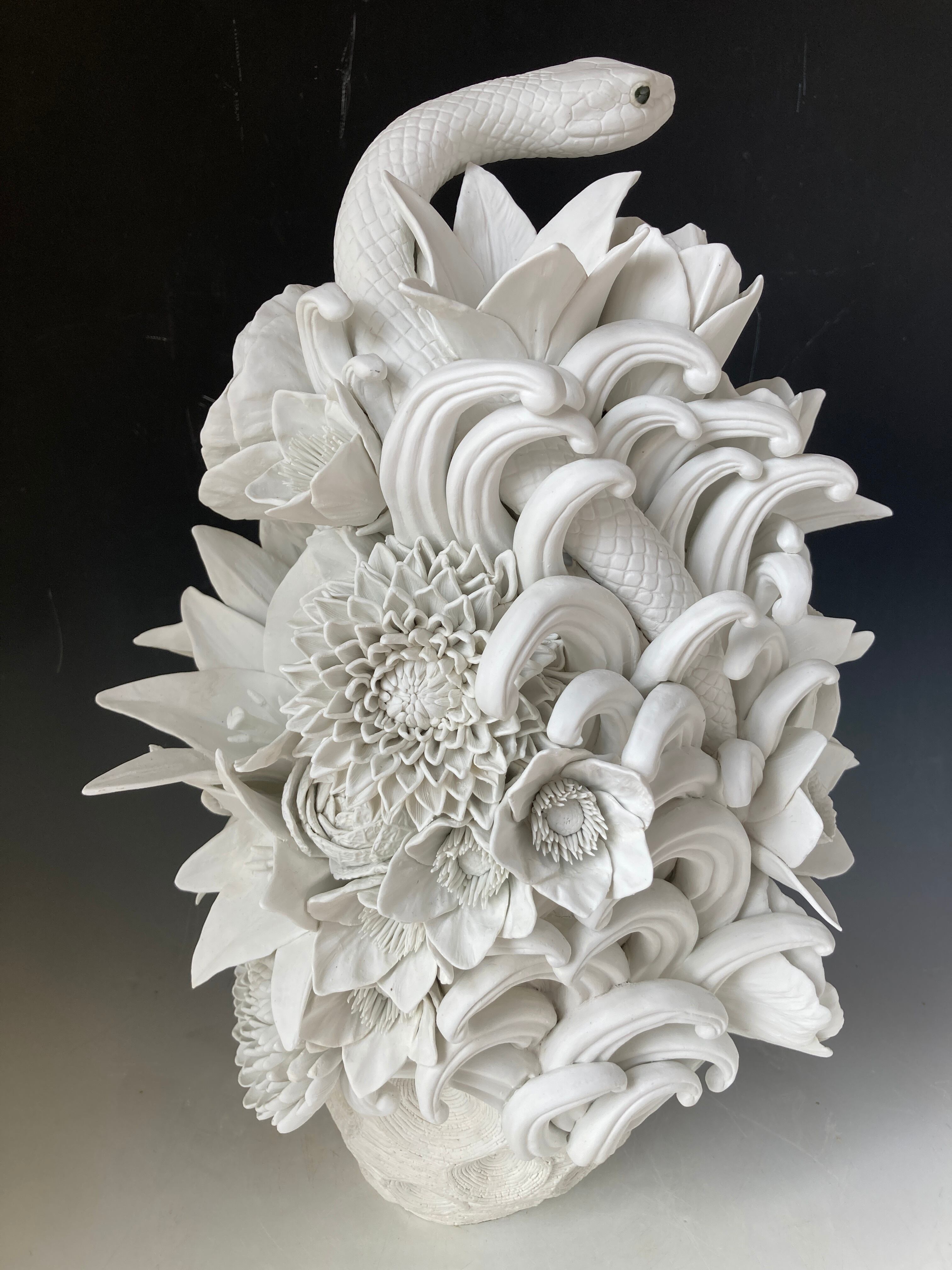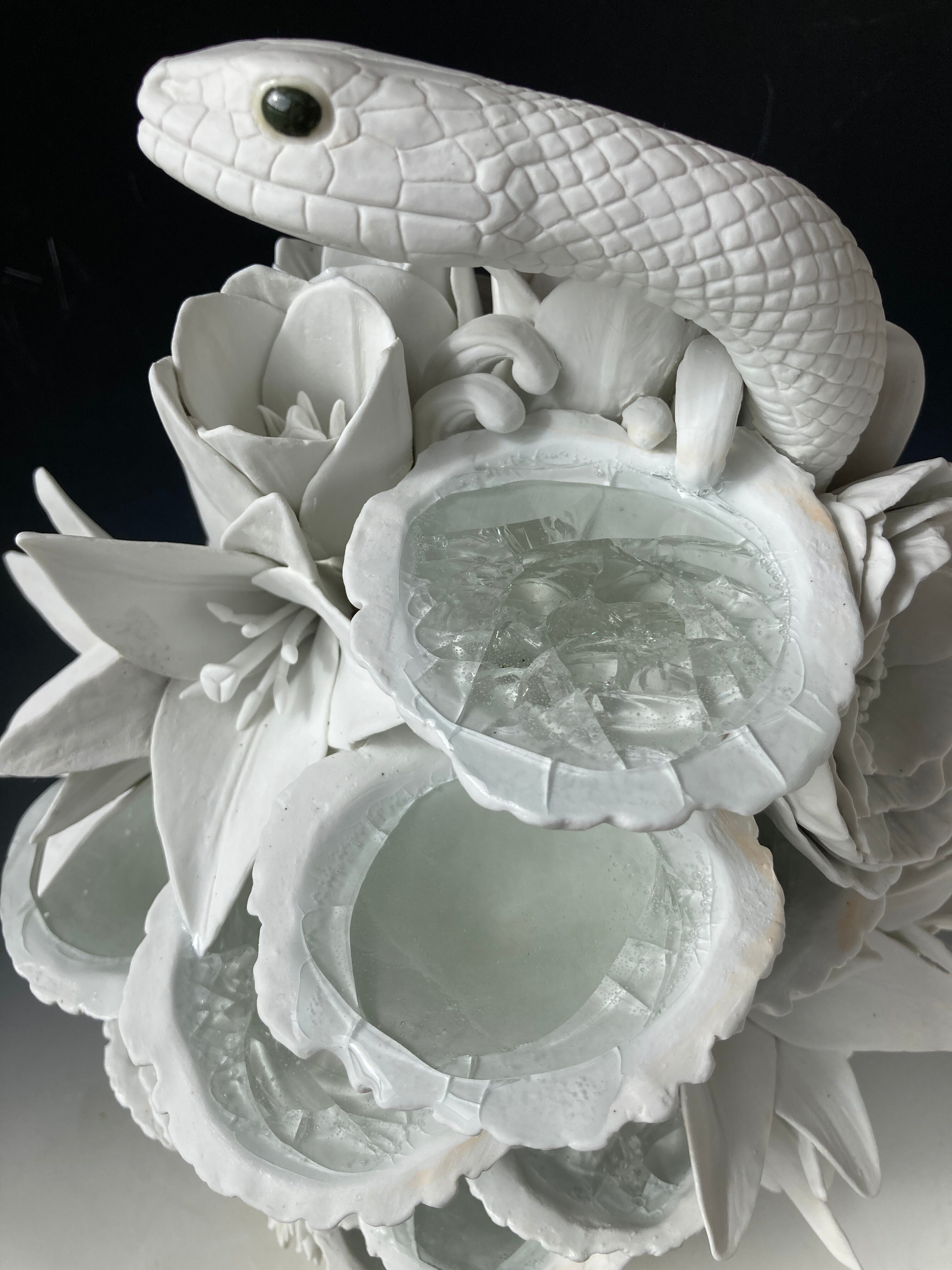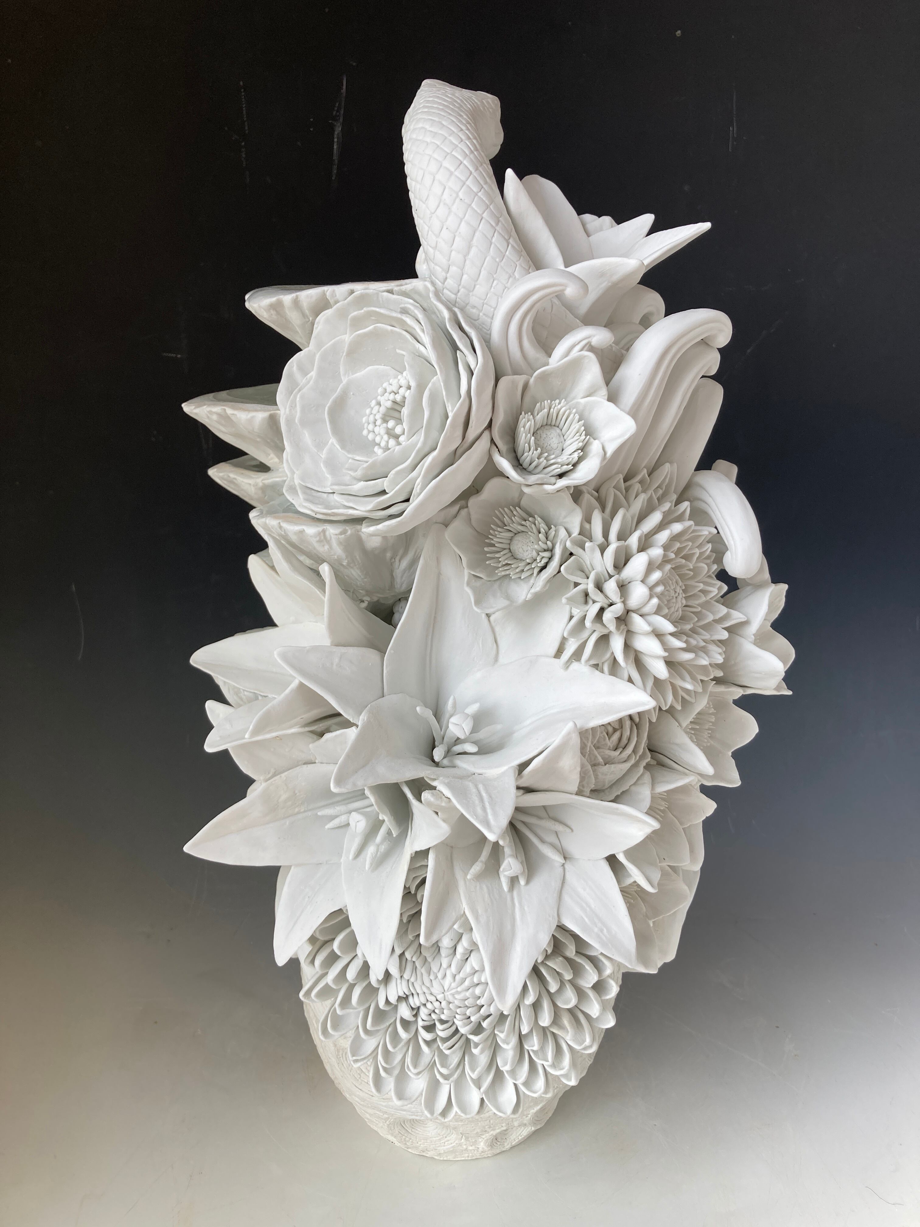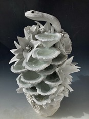 The "YUGAHUSHIMA" series follows this pattern, with the whorls of fine porcelain and porcelain layers below the surface of the water, and the accumulation of flowers, fruits, and tubular forms representing life force above the water, forming a single illusory "island" that evokes a sacred island where deities gather, like Mount Horai or Hodagakure.